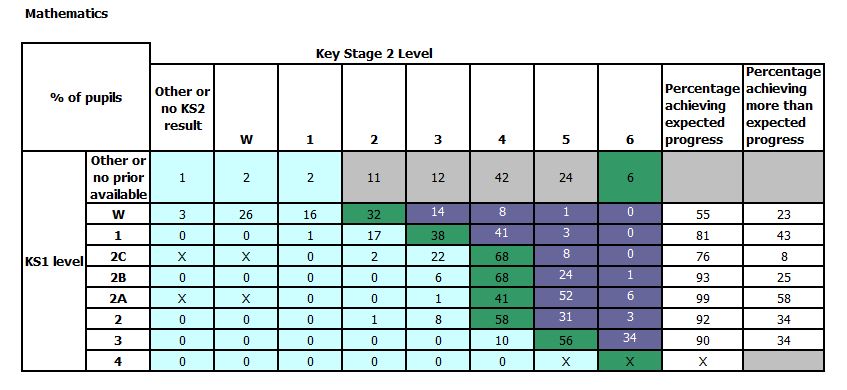 • Progress rates varied significantly for the handful of pupils recording KS1 L4. In reading only 7% made the expected progress to KS2 L6, whereas 77% did so in writing. The outcomes in maths have been suppressed.