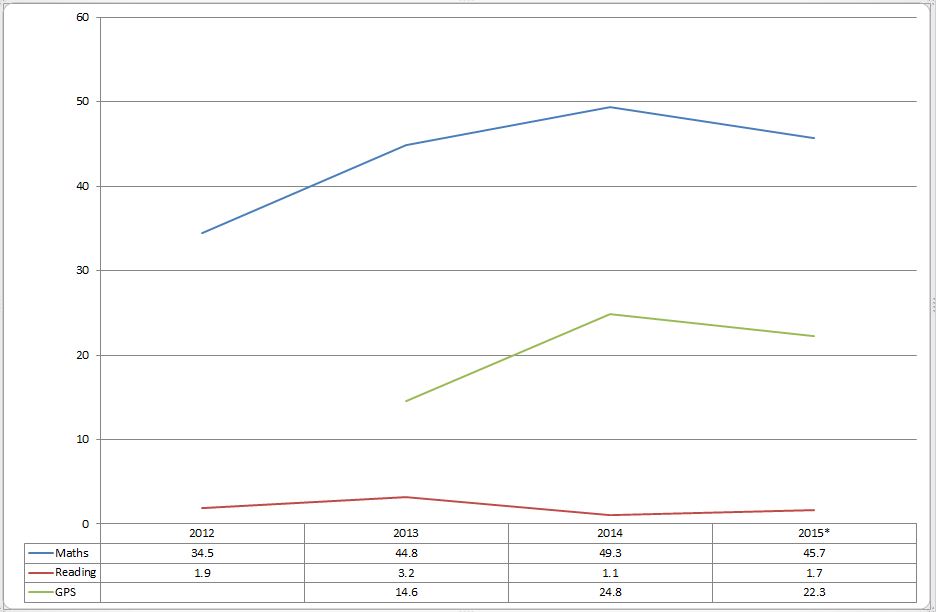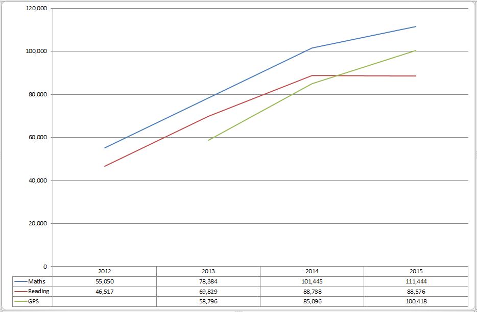 I had expected that confirmation of the abolition of L6 tests would depress 2015 entries severely across the board. But only in the reading test did entries fall below their 2014 level – and then only slightly.