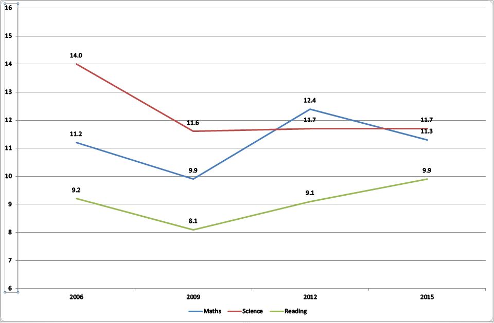 - In maths performance at proficiency level 5 and above is almost identical to where it was in PISA 2006, though it has fluctuated betweentimes. Equivalent performance in science is 2.3 percentage points lower than in 2006 but has changed hardly at all since the 2009 cycle. In reading performance has improved steadily since a dip in 2009 and now stands 0.7 percentage points higher than in 2006. This is illustrated by chart 2, below.
