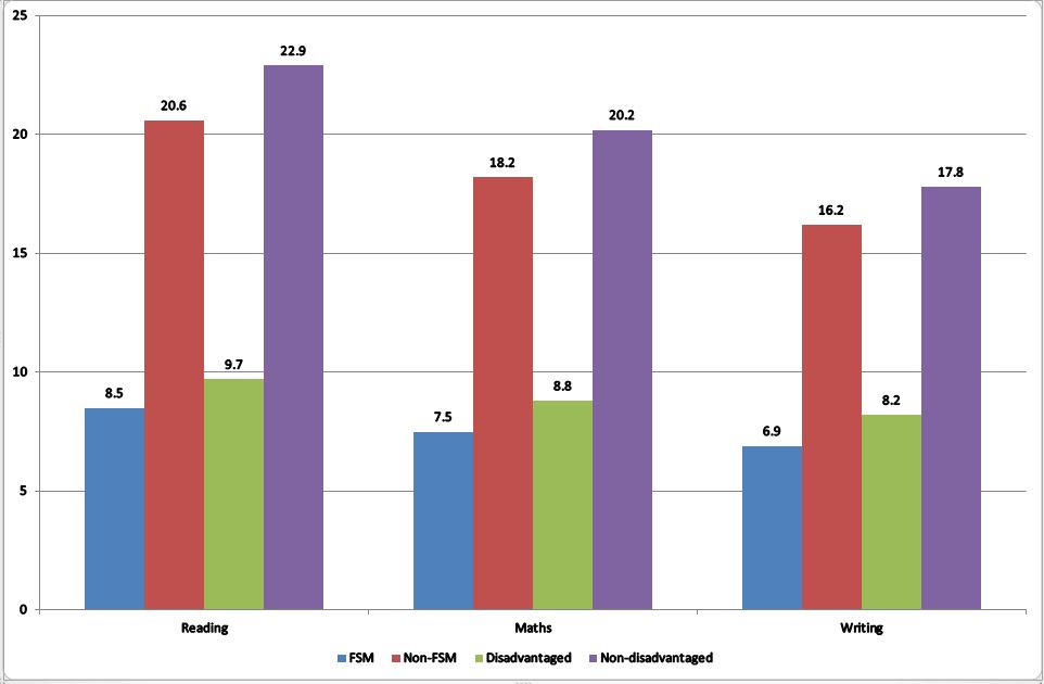 - As for the individual assessments, there were FSM excellence gaps – between the percentage of FSM-eligible pupils and the percentage of all other pupils achieving a higher standard (or WAGD in writing) – of 12.1 percentage points in reading, 10.7 points in maths and 9.3 points in writing.