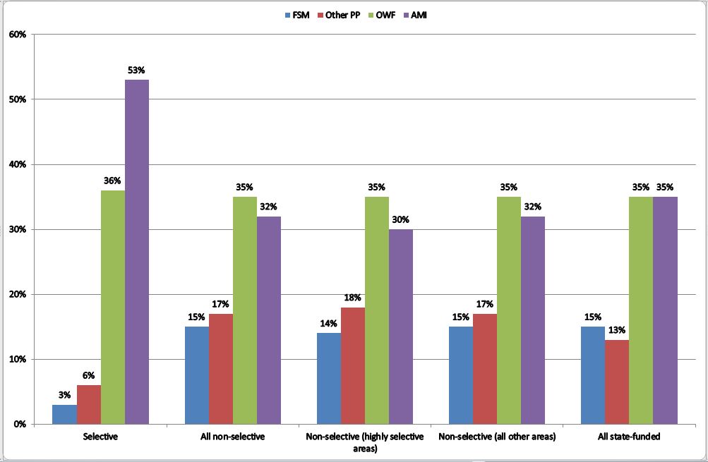 It is true enough, but does not detract from the fact that OWF learners are already relatively successful in passing the 11+ because they are equally as well-represented in selective schools as they are in non-selective schools: the real disparity is between disadvantaged and AMI learners.