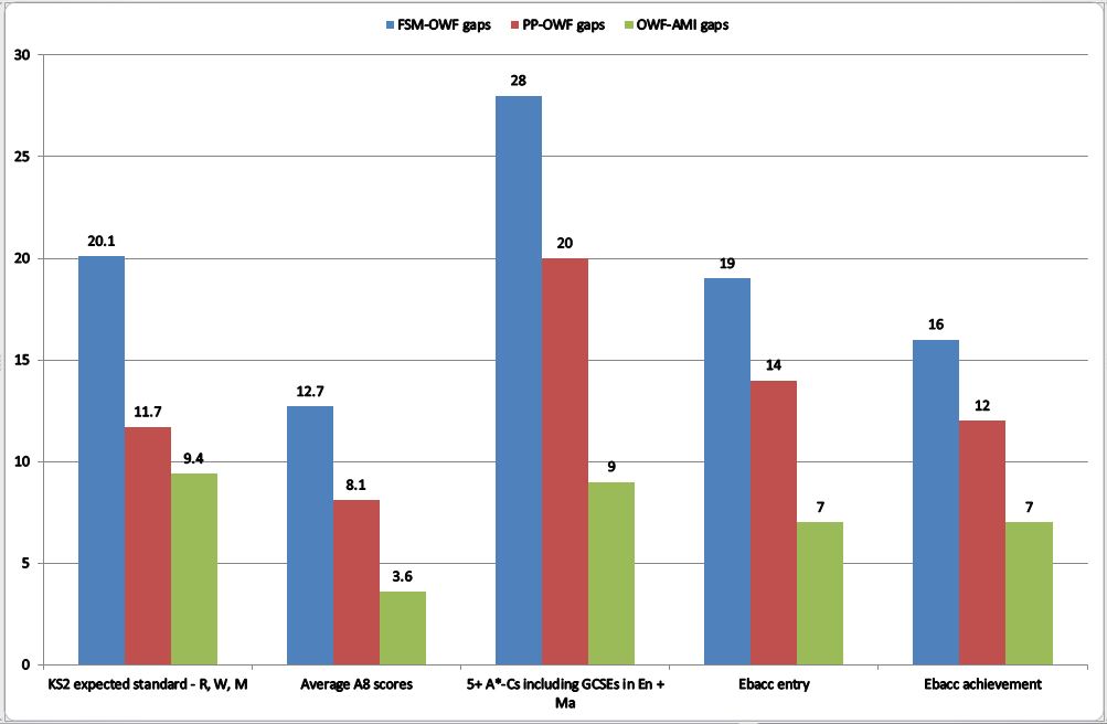- It obfuscates the sizeable gaps between disadvantaged and OWF learners by drawing out distinctions between the performance of FSM and pupil premium learners. While it is important to understand the range of disadvantage evident within the pupil premium category – and the argument has been made elsewhere for retaining this distinction – it risks over-complicating and diluting the collective policy response.