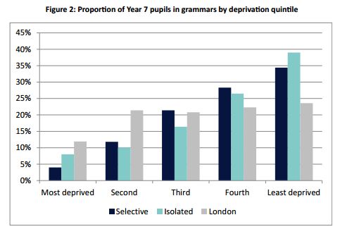 The grammar school table (reproduced below) shows that, outside London, the proportion of Year 7 pupils attending grammar schools increases by IDACI quintile.
