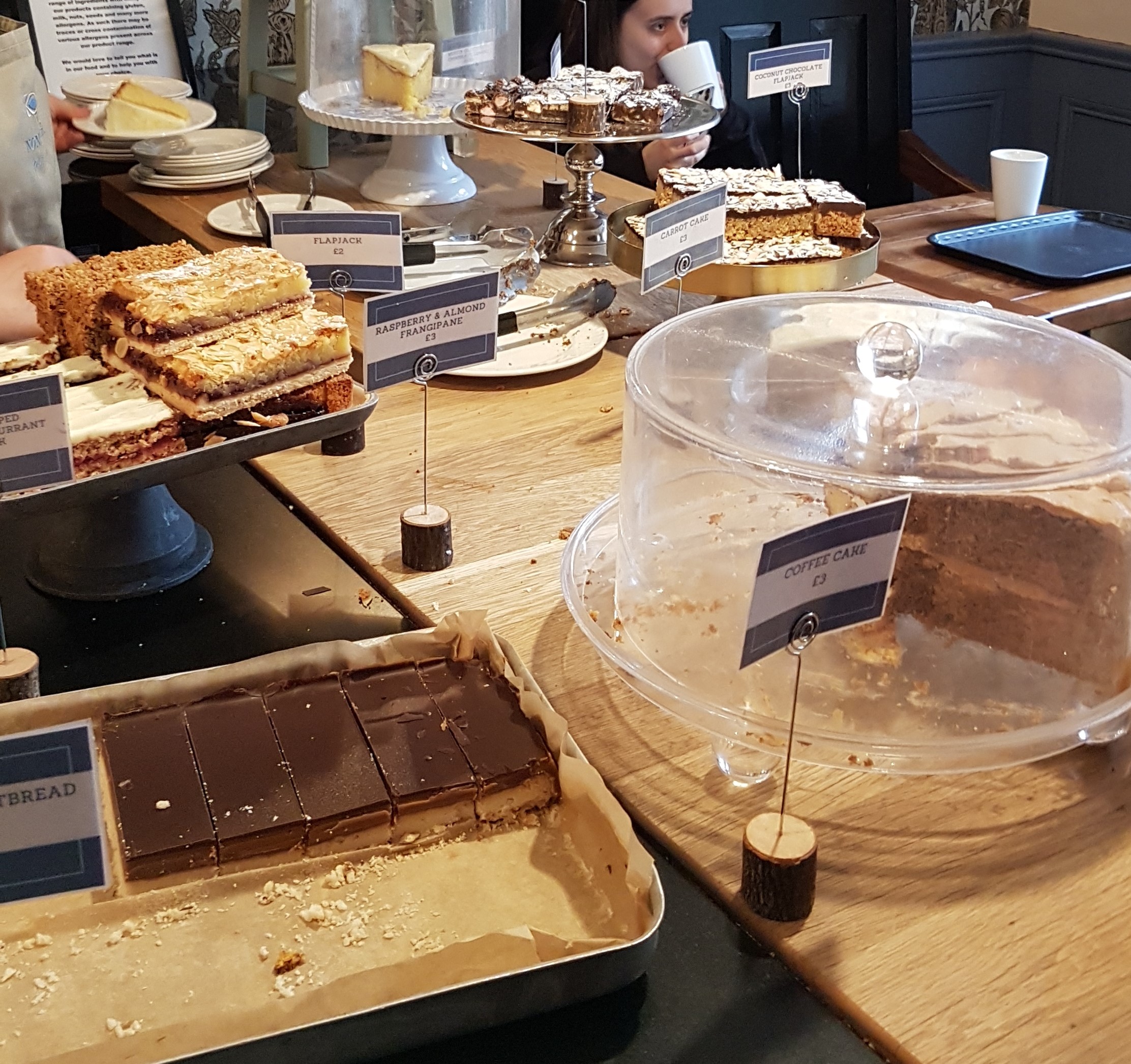 The attractive counter was relatively well-stocked with cakes and offered the usual coffees, including the option of an extra shot (20p). We couldn’t see advertised a discount for those bringing their own cup.