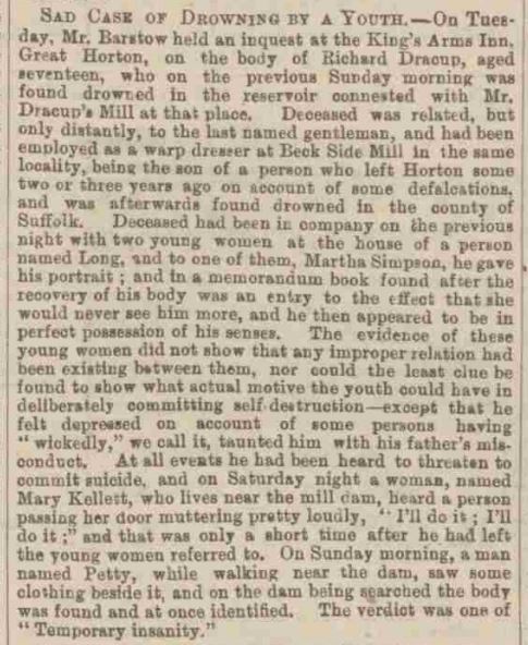 ‘SUSPECTED SUICIDE IN BRADFORD. – On Sunday morning the body of Richard Dracup, 16 years of age, residing in Westcroft Terrace, Great Horton, was found in the old corn mill dam at Great Horton. A man named Petty was taking a walk by the side of the dam, when he saw a man’s clothes on the bank. He concluded that some man was drowned, and on a search with drags being made, the deceased was found.’