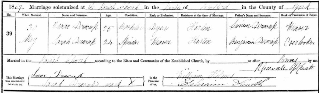Simeon Dracup married Hannah Sowden in St Peter’s (Bradford Cathedral) in February 1829, when both were aged 24. Hannah was the daughter of Robert Sowden, a Great Horton weaver. Simeon was also a weaver.