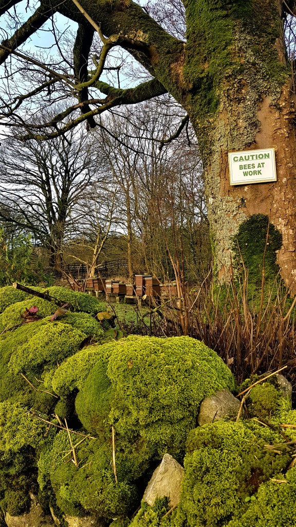 Crossing Threshfield Beck shortly after Threshfield itself, we followed a footpath marked for Grysedale Lane and Skirethorns Lane, pausing to admire a row of beehives on the other side of a mossy wall, passing shortly afterwards through the imposing entrance to Wood Nook Caravan Park.