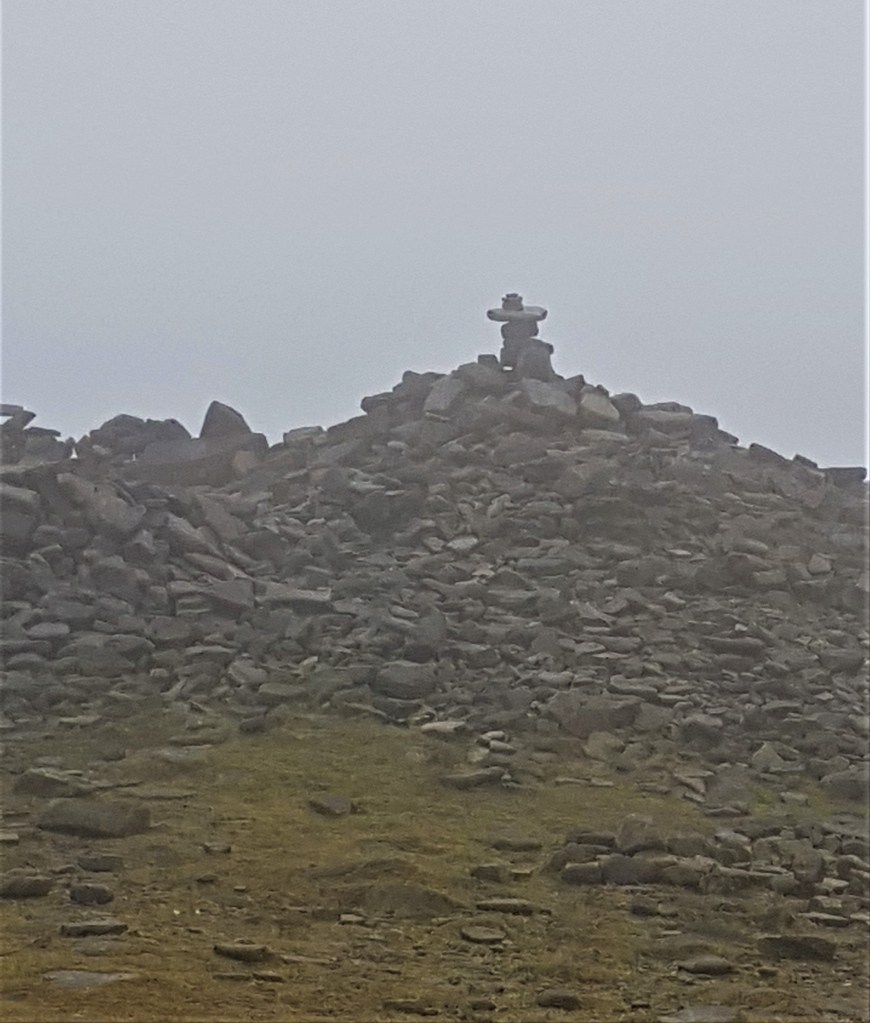 By the time we arrived at the summit the low cloud had descended with a vengeance. We clustered for warmth against the sheltering wall, built for those visiting the summit, and took our lunch while staring at the non-existent view. Behind us another group was enjoying a birthday lunch and we joined in ‘Happy Birthday’ to warm ourselves a little more.