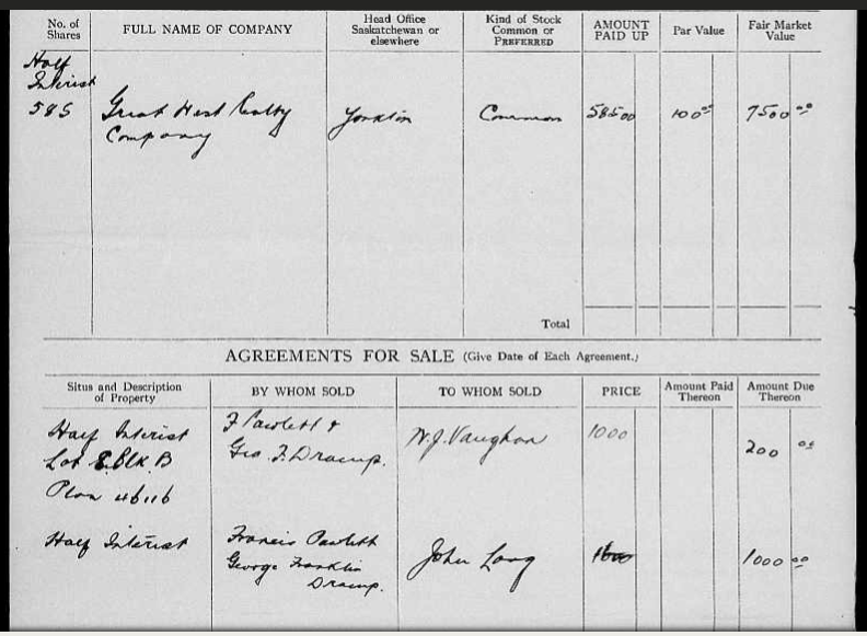 By far the largest element in the assets left by George is a half interest in 585 shares in the Great West Realty Company, based in Yorkton. These are valued at $7,500.