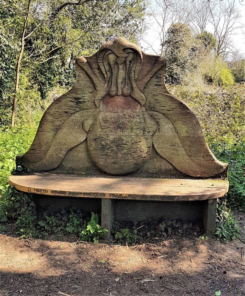This carved wooden bench is said to feature a bee orchid and there is reputedly a companion piece at the end of the route in Dover. This one is badly weathered, frankly, and could do with restoration.