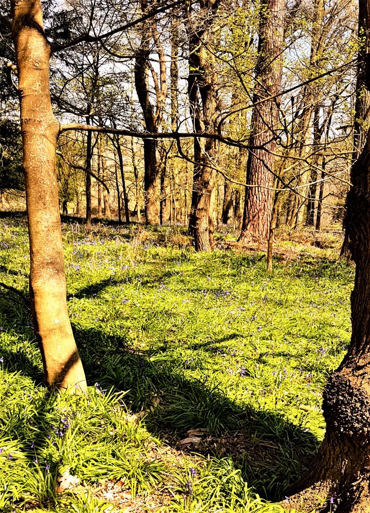 We soon emerged into a clearing with views across to the Hog’s Back before entering Totford Wood. Here we broke for lunch, seated on another upturned tree, looking out over clumps of bluebells dappled by the spring sunshine filtered through the trees.