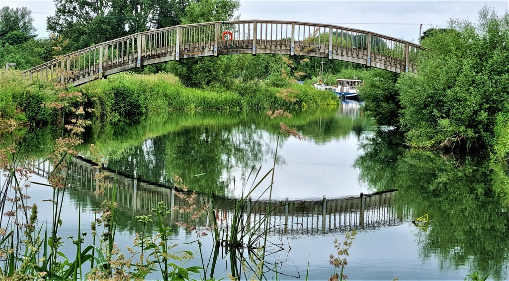 Forgoing the pleasures of Buscot Village and its teashop, we resumed our walk, soon passing the footbridge at Eaton Weir, where there is no longer a weir, and over another near Kelmscott.