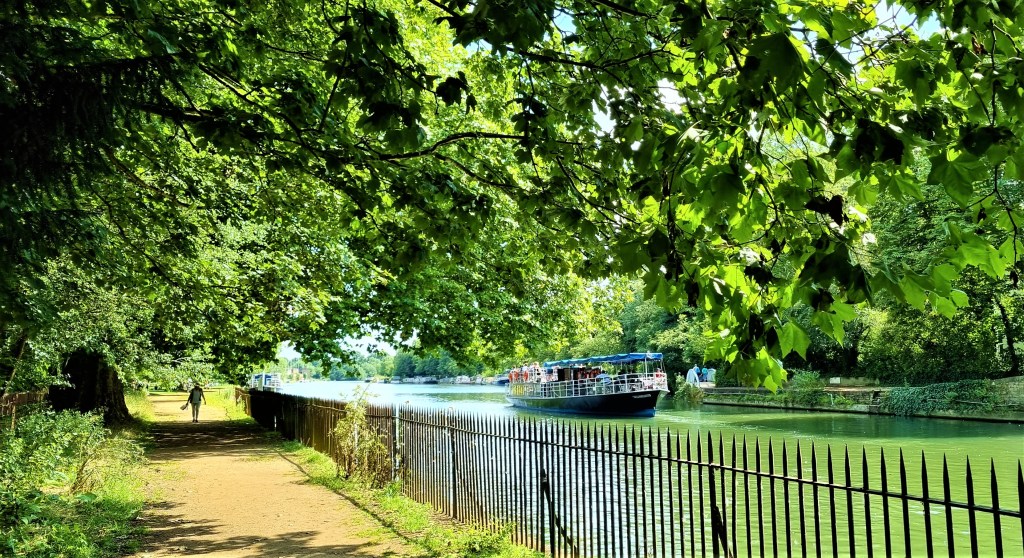 Just out of Newbridge we paused to float off some petals then, after passing Hart’s Weir Footbridge, the only landmark hereabouts, we stopped to talk to a lady dog walker who had recently retired to the area. She liked the idea of walking the Thames Path but felt her husband might be hard to convince!