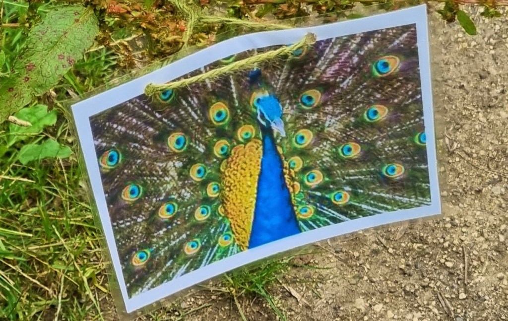Here we came upon several birds of prey wheeling above us in the sky, then a picture of a peacock tied to a bush.