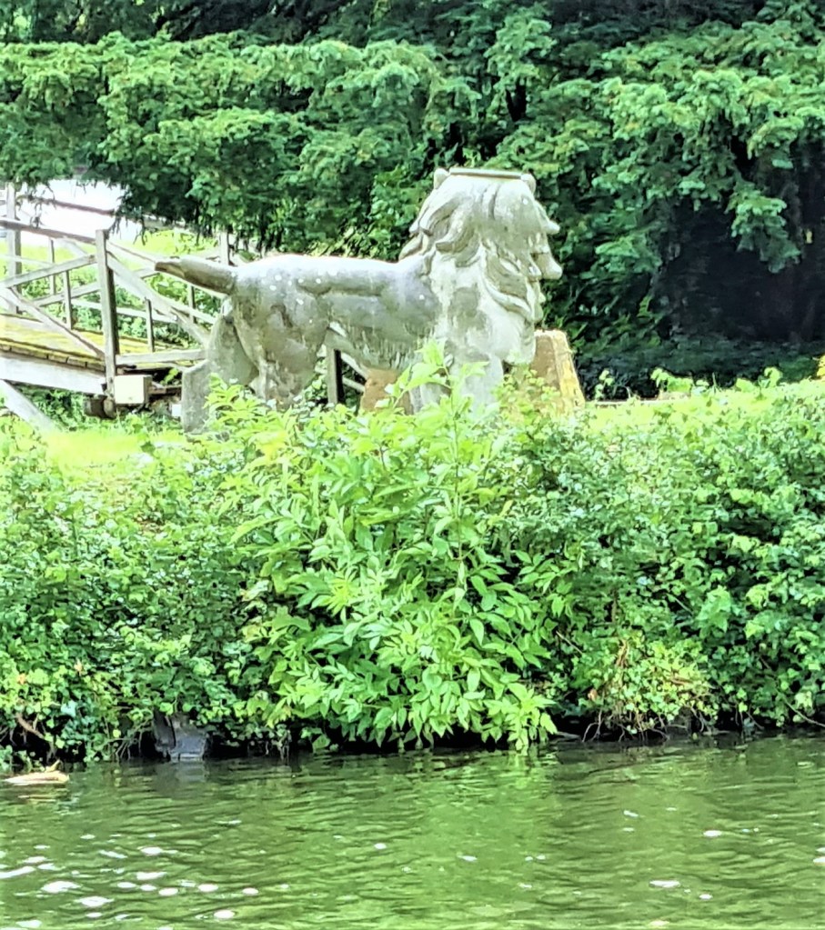 The Thames divides at Godstow, passing round a small island. On one side lies The Trout, dating from the Seventeenth Century, which and most probably evolved from the Abbey’s guest house. It had a walk-on part in Chapter 1 of Waugh’s Brideshead Revisited. We were quite taken by the stone lion patrolling the riverbank.