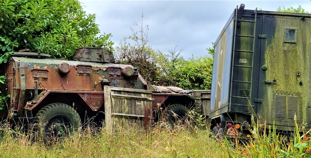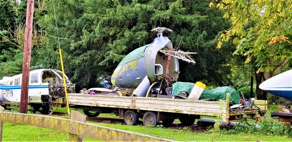 Passing a trig point and along a bridleway past several houses, we found a second rusting garden display, this time comprising broken small aircraft and helicopters.