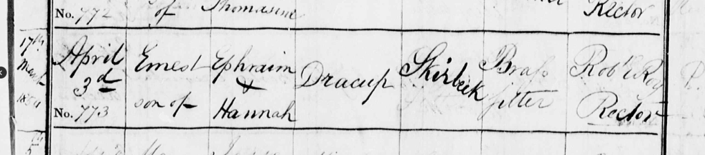 Ephraim was the second son of Eli Dracup (1799-1837) and his second wife Elizabeth (Betty), (also nee Mitchell), (1804-1869).