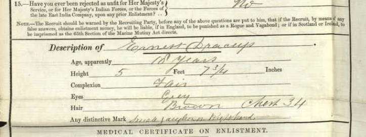 He is described as five feet seven and three-quarters of an inch tall, with a 34 inch chest, a fair complexion, brown hair and grey eyes. He has one distinguishing feature: a small ganglion on his right hand.