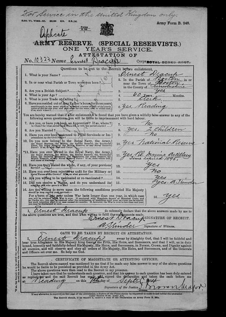 The record survives of Ernest senior’s formal recruitment as a special reservist in the Royal Berkshire Regiment on 7 September 1914. The form is headed ‘For service in the United Kingdom only’. He was aged 60.