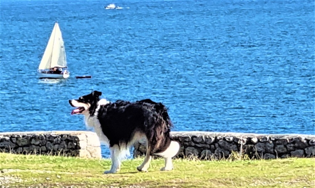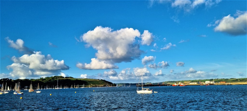 At Pendennis Point we decided it was high time for ice-cream. We watched the yachts scudding through the water, the antics of a dog nearby and a tug towing in what looked like a wreck with a digger perched on top.