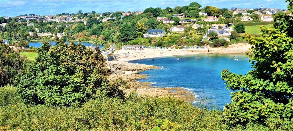 Swanpool was basking in the mid-afternoon heat as we passed behind it, continuing past the beach huts and then on round to Gyllyngvase Beach (from the Cornish for ‘the shallow inlet’). This was busy with tourists and newly-arrived students, congregated in large groups.