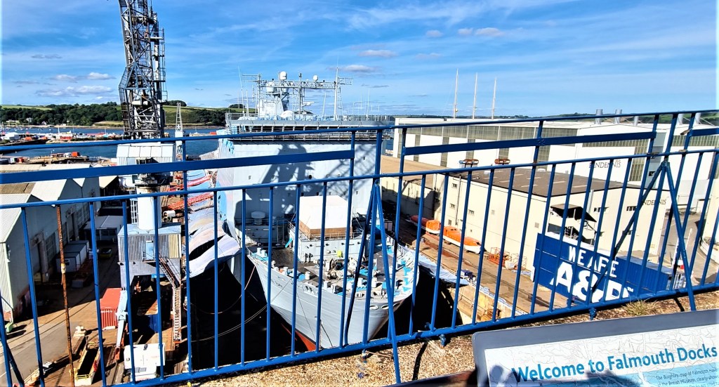We paused to admire RFA Lyme Bay in dry dock – a coincidence, since the same ship is shown in the same place in our guide book, published in 2018!