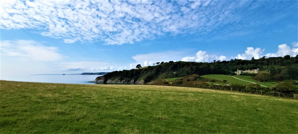 Soon we were walking over grassland, past the coastguards’ lookout (licensed for weddings) and on round to the road behind Porthluney Bay, Caerhays Castle just behind us.