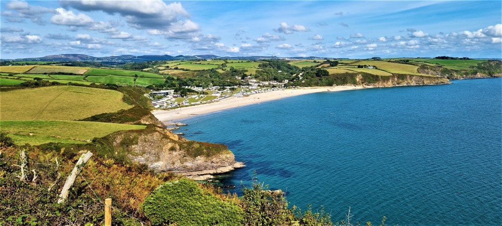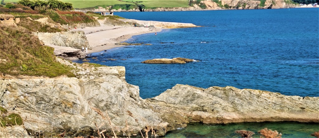 Exiting Dodman Point, we could see ahead the long narrow stretch of Vault Beach. It is reputed to harbour naturists but was too far away to tell!