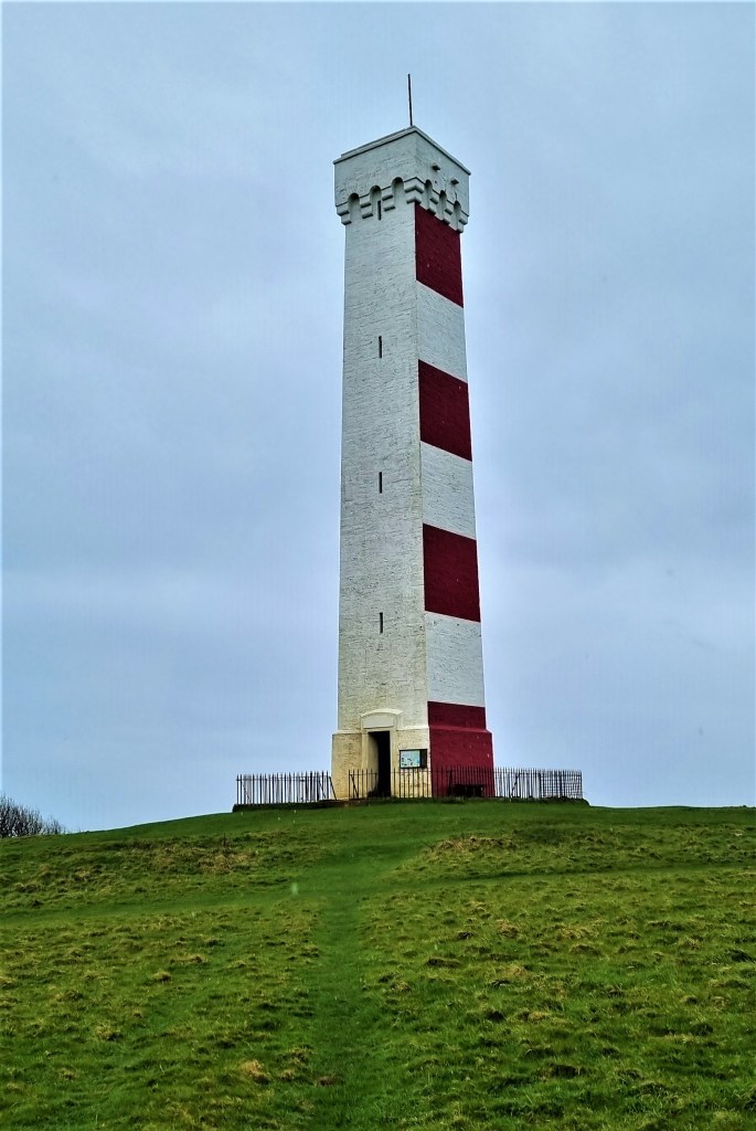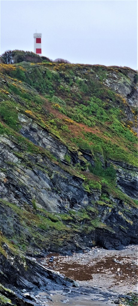 Shortly after Polkerris, the rain began in earnest, growing steadily heavier. Soon we could see the Gribbin Daymark, perched on Gribbin Head, an 84-foot red-and-white striped ‘Greco Gothic square tower’, built by Trinity House in 1832.