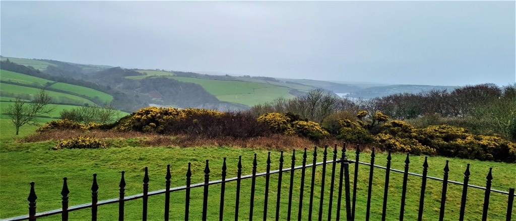 The entrance was locked, but we sheltered in the doorway to eat our sandwiches. Even in the relentless drizzle, the view across Polridmouth Cove towards Fowey was enchanting