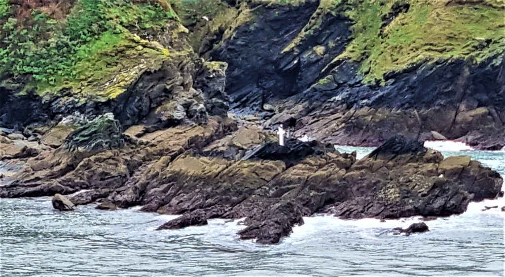 Soon after resuming, we spotted the greenish-yellow Hore Stone and then our first glimpses of Looe Island. This is another site alleged to have been visited by Joseph of Arimathea with the infant Jesus, and it certainly had religious significance for early Christians.