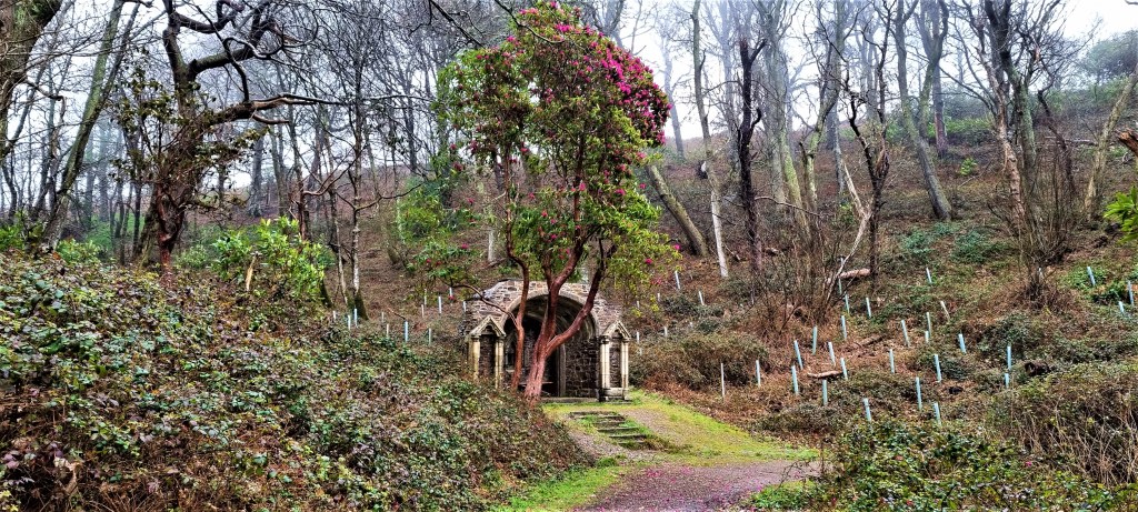 There is thought to have been a watch house here prior to the Gothication of the cave, to commemorate a visit by William IV and his wife in the 1820s, during the lifetime of Richard, the Second Earl of Mount Edgcumbe.