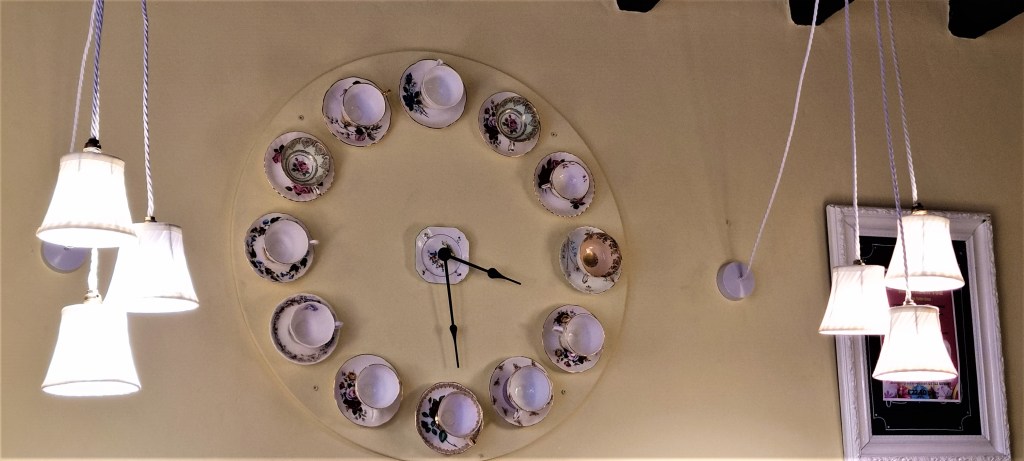 Here we diverted a short way to take afternoon tea at the delightfully anachronistic Tudor Rose Tea Rooms, where the wall clock drew our attention. A lady with a lot to say spoiled the genteelly civilized atmosphere.