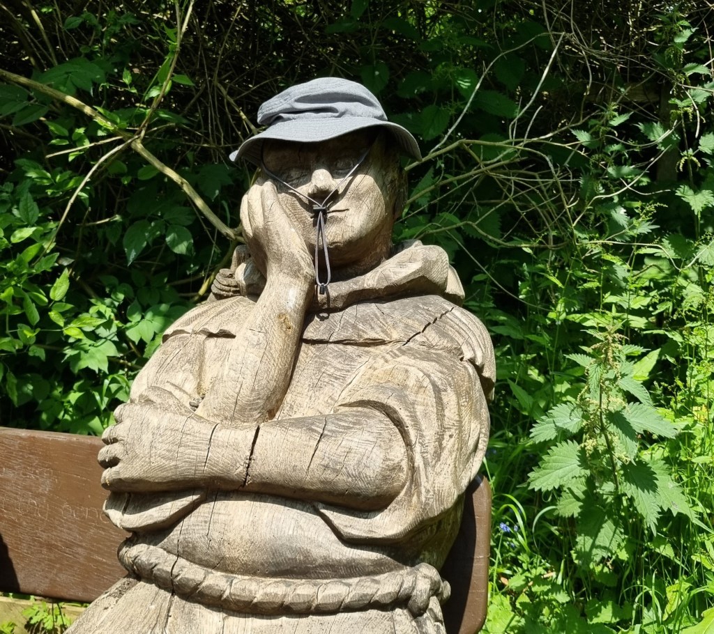 Soon we arrived at the Pilgrim’s Rest Bench, where Brother Percival reclines, dozing in the warm sun. We joined him for a while, donating him a sun hat and taking selfies until it was time to press on.