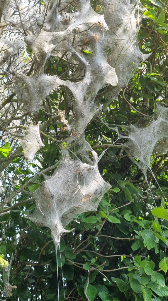 Passing above Lenham, we encountered many poppies in the field borders and a major infestation of ermine moths in the hedgerow, creating dense white webs spun across the branches.