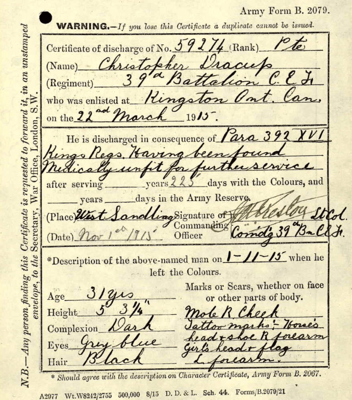 He claimed that he had received 99 Canadian dollars in post-discharge pay, while Nellie had received 60 Canadian dollars. (As noted above, Christopher himself received the full amount of just over 160 dollars in 1917, after Nellie’s death)