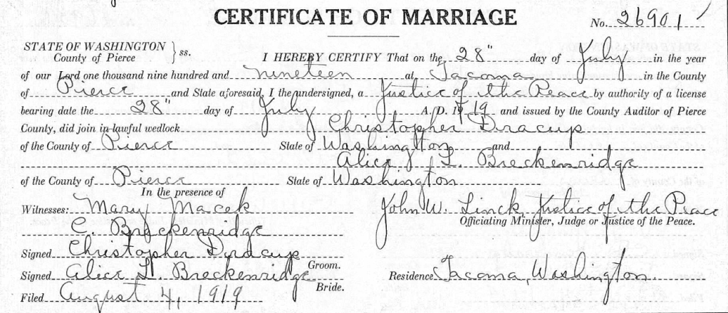 He surfaces next in Tacoma, Pierce County, Washington. On 28 July 1919, he was married there, to Alicia Leah Breckenridge. He was now 40 years old; she was 29.