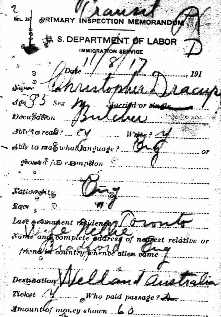 He gave his nationality as British and his birthday as June 15 1882 (rather than 1879). He stated that he was married to Alice on 15 July 1918 (rather than 28 July 1919) and that he had no children. He adds that he entered the USA at Port Huron on November 8 1917.