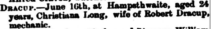 A newspaper report gives Christiana’s date of death as 16 June 1879, at Hampsthwaite. This most likely places Christopher’s birth at 15 June 1879 (though he had other alleged birthdays – see below) and strongly suggests that Christiana died from the complications of childbirth.