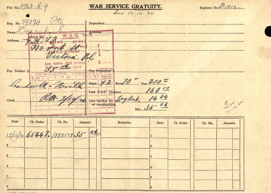 In October 1920, he submitted an application for War Service Gratuity, which is preserved in his service record. In this, he gives as his place of residence not Tacoma but ‘GWVA Rooms, 710 Fort Street, Victoria, B.C’.