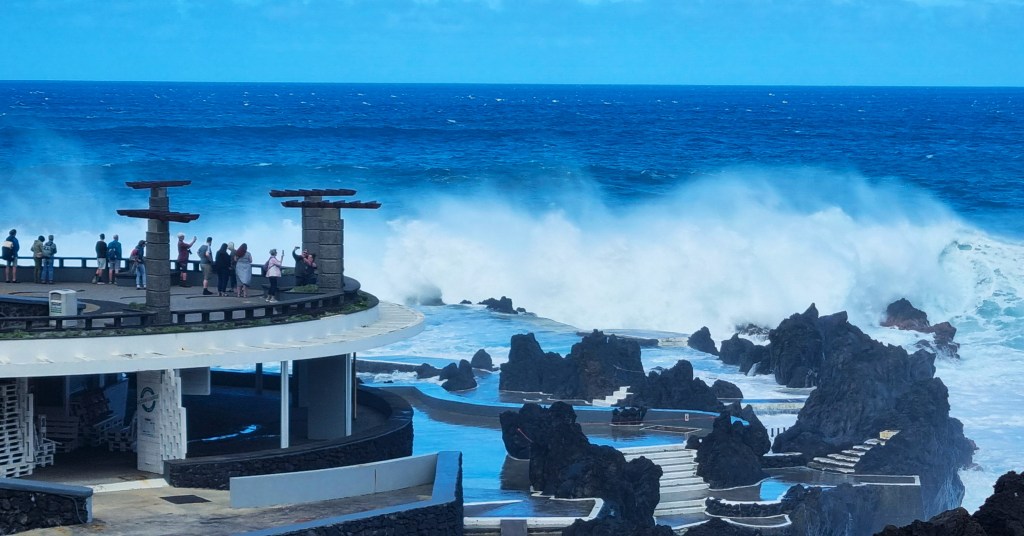 The pools were closed to swimmers, given the volume and velocity of the waves washing over them. Several foolhardy people stood on a squat circular tower just behind the westerly pools, taking selfies with the spray in the background.