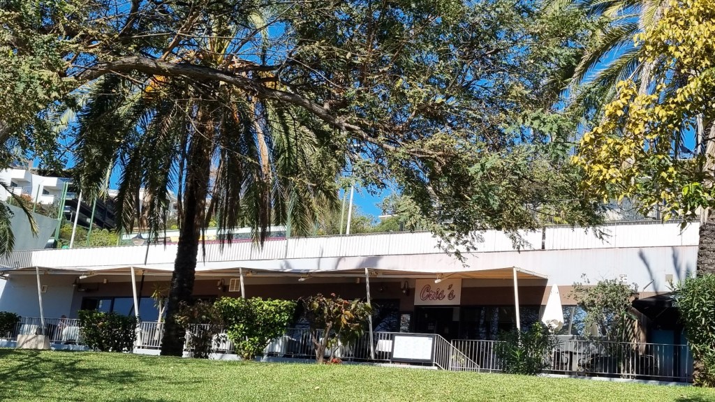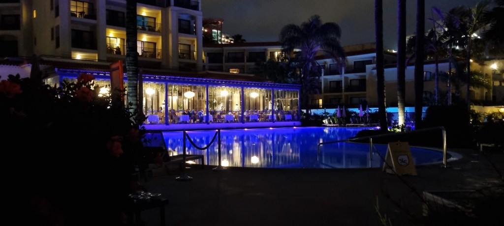 After unpacking and admiring the view from our balcony, we began an orientation walk, initially round the gardens and then through the interior. Eventually we repaired to the Veranda – a poolside bar and café – for lunch.