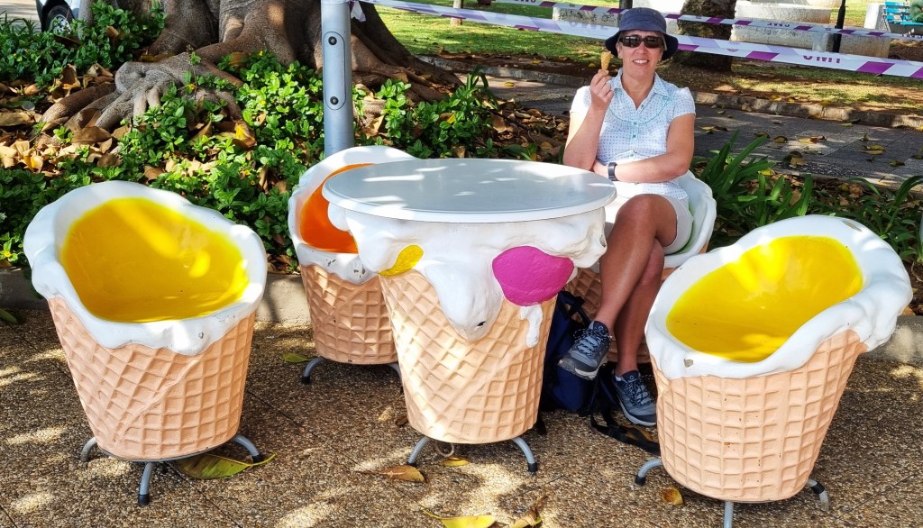We returned to the Lido Beach Club for ice cream, sitting on the ice cream furniture – the ultimate in kitsch – while someone climbed up on to the roof of the gelateria beside us.