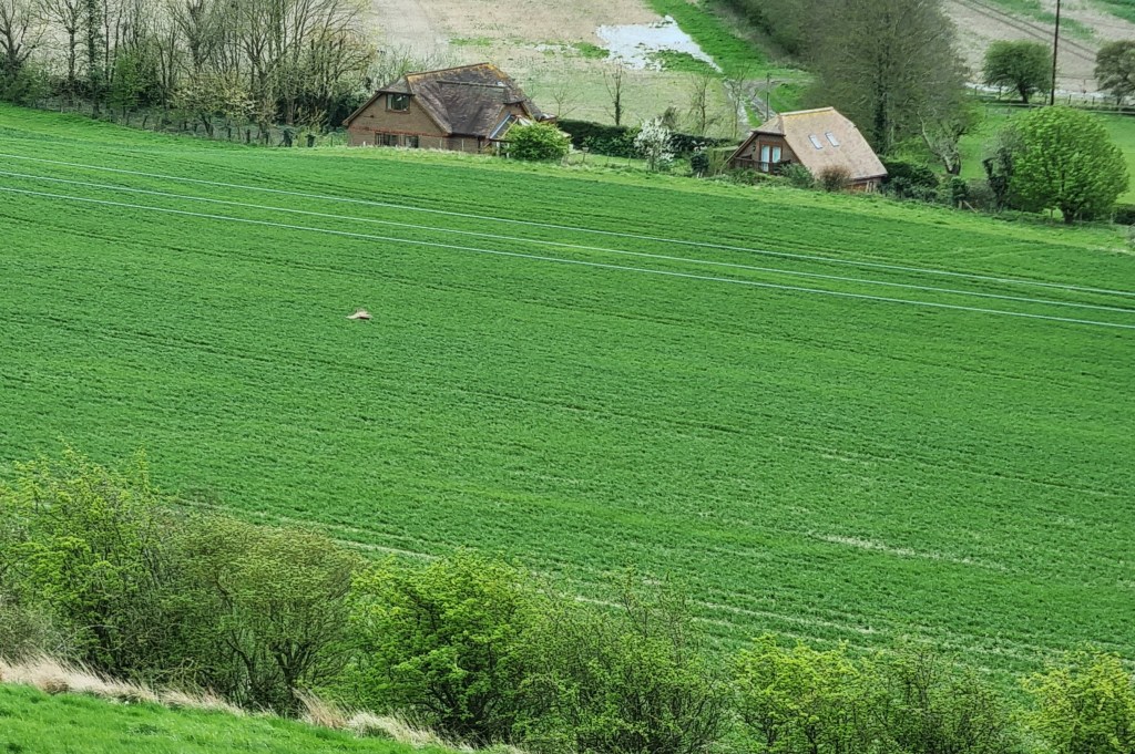 Finally we descended past an army training area, pausing for a view of Summerhouse Hill before arriving at the edge of Etchinghill.