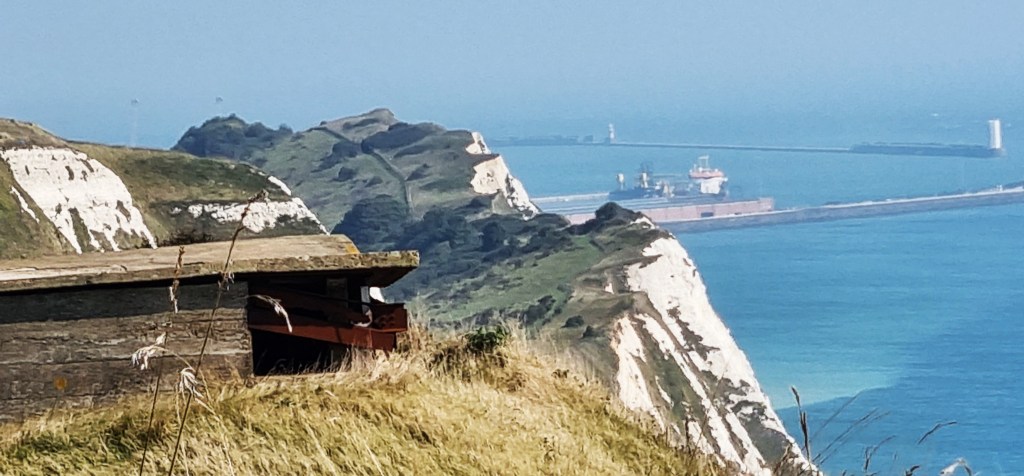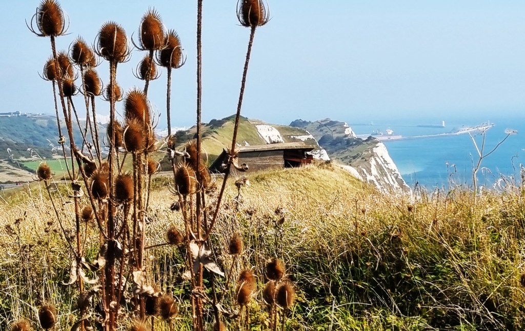 Soon we had Dover Harbour in view, teasels and a wartime shed in the foreground; Shakespeare Cliff in the middle distance.