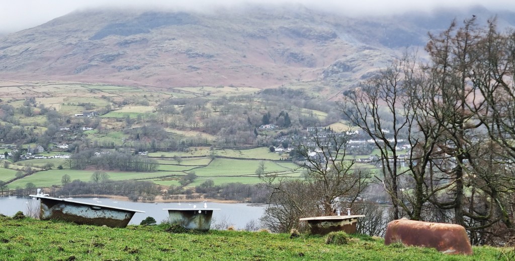 I enjoyed this moss-covered wall, with the trees behind it and, subsequently, the view down to Coniston Water across an array of old bath tubs.