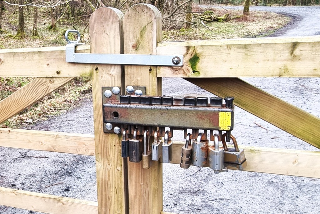 On resuming, and approaching ground level, we passed an impressive collection of nine padlocks upon a wooden gate, then swung round close to Tock How Farm before crossing to Hawkshead across fields from the north.