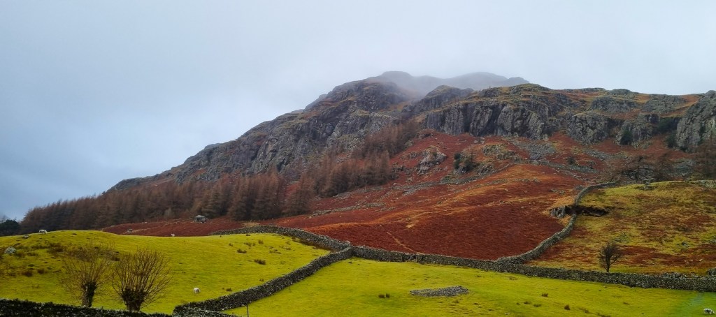 All three walks were in the Langdale Valley, which is renowned for its beauty. Unfortunately though, the weather was least kind to us on this day, with heavy low cloud, regular showers and even some sleety snow on top of the fells.