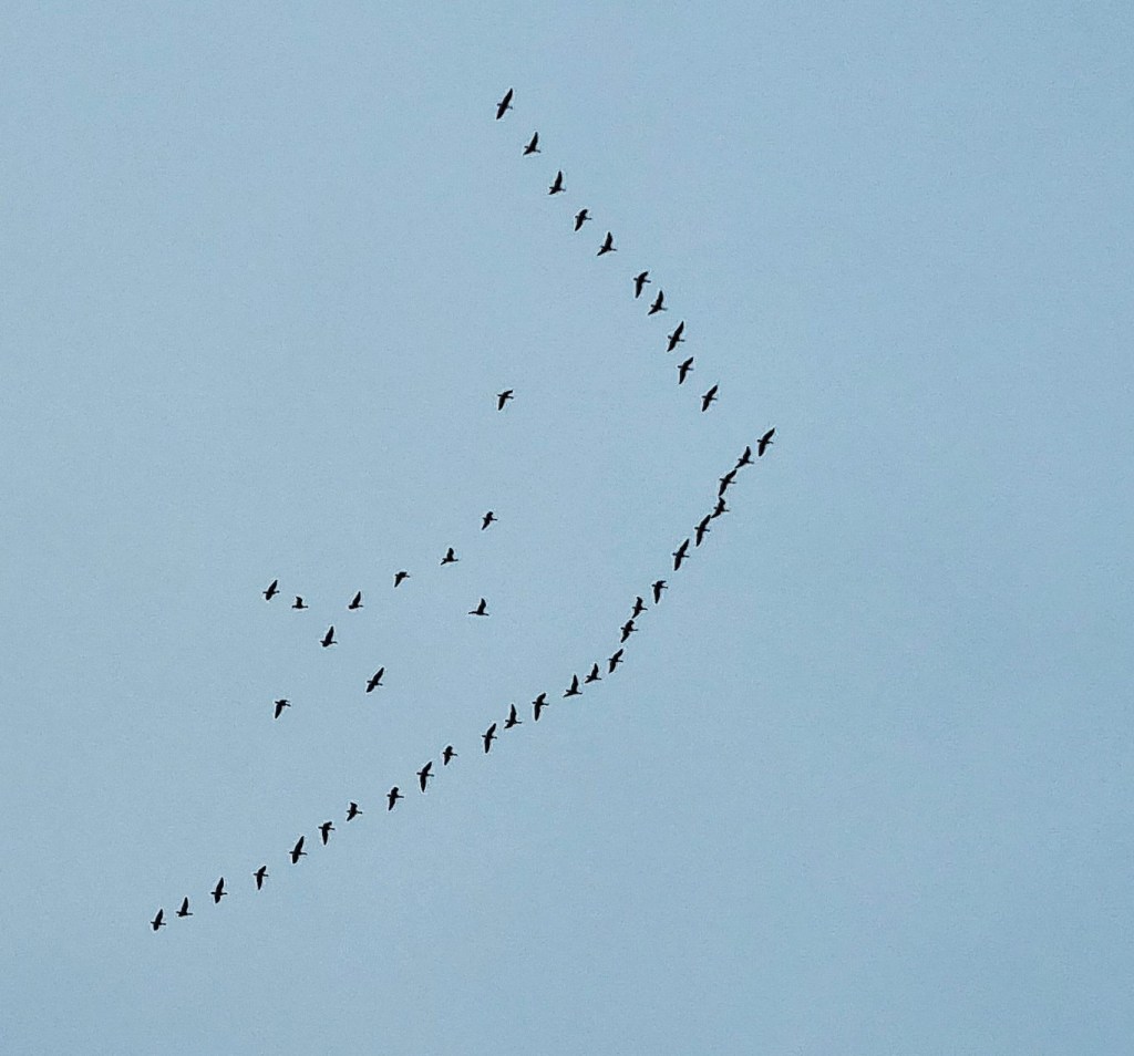 This is believed to improve their efficiency in flight. Apparently, different birds have different preferences for where they fly – whether on the left, the right or in the middle, but there is regular rotation to relieve the birds flying at the front and the two ends of the chevron, where fatigue is greatest.