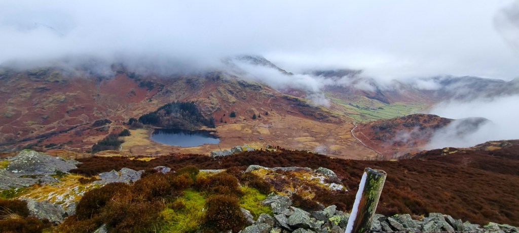 Finally, as we reached the peak of Side Pike – 362m high – the cloud parted to reveal Blea Tarn once more, now far below.